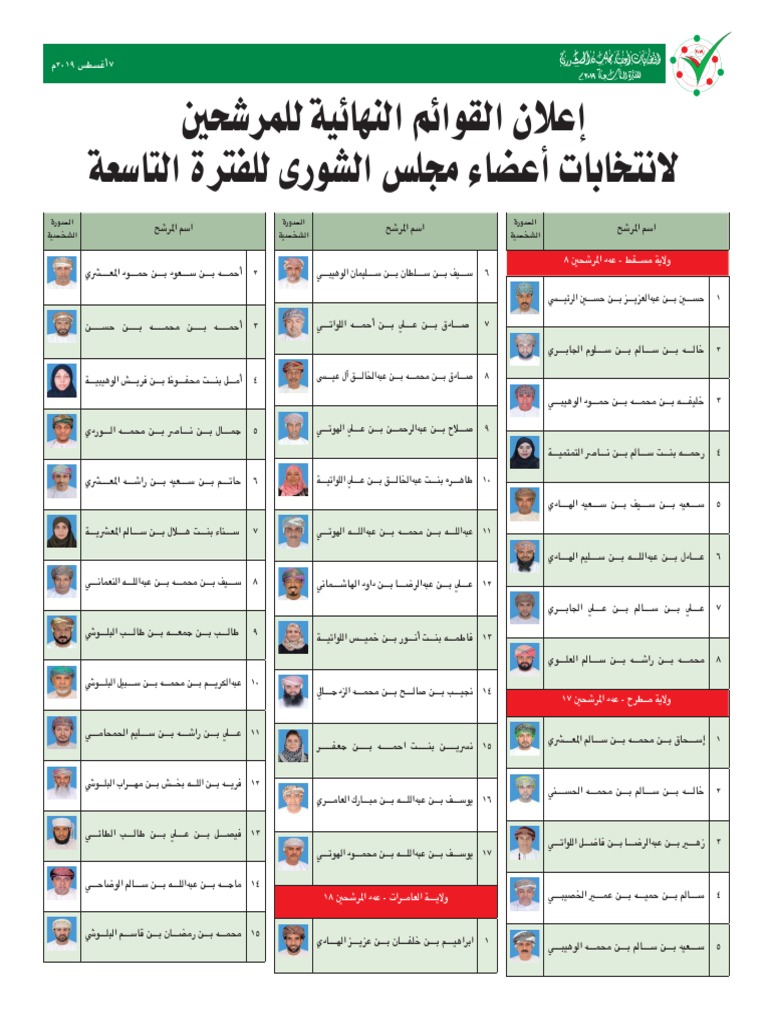 Al Wisal الوصال On Twitter العمانية إعلان القائمة النهائية بأسماء المرشحين لانتخابات أعضاء مجلس الشورى للفترة الثامنة محافظة مسقط قريات مسقط Http T Co Pjpxynkcqi