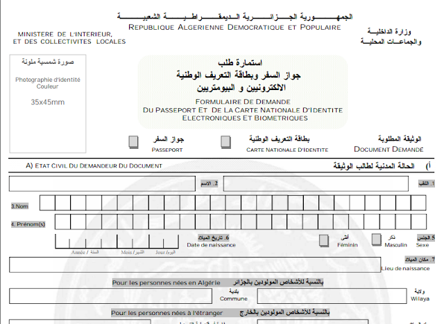 تحميل استمارة طلب بطاقة التعريف الوطنية الجزائرية وجواز السفر الجزائري الالكترونيين البيومتريين Biometrics Life Cards