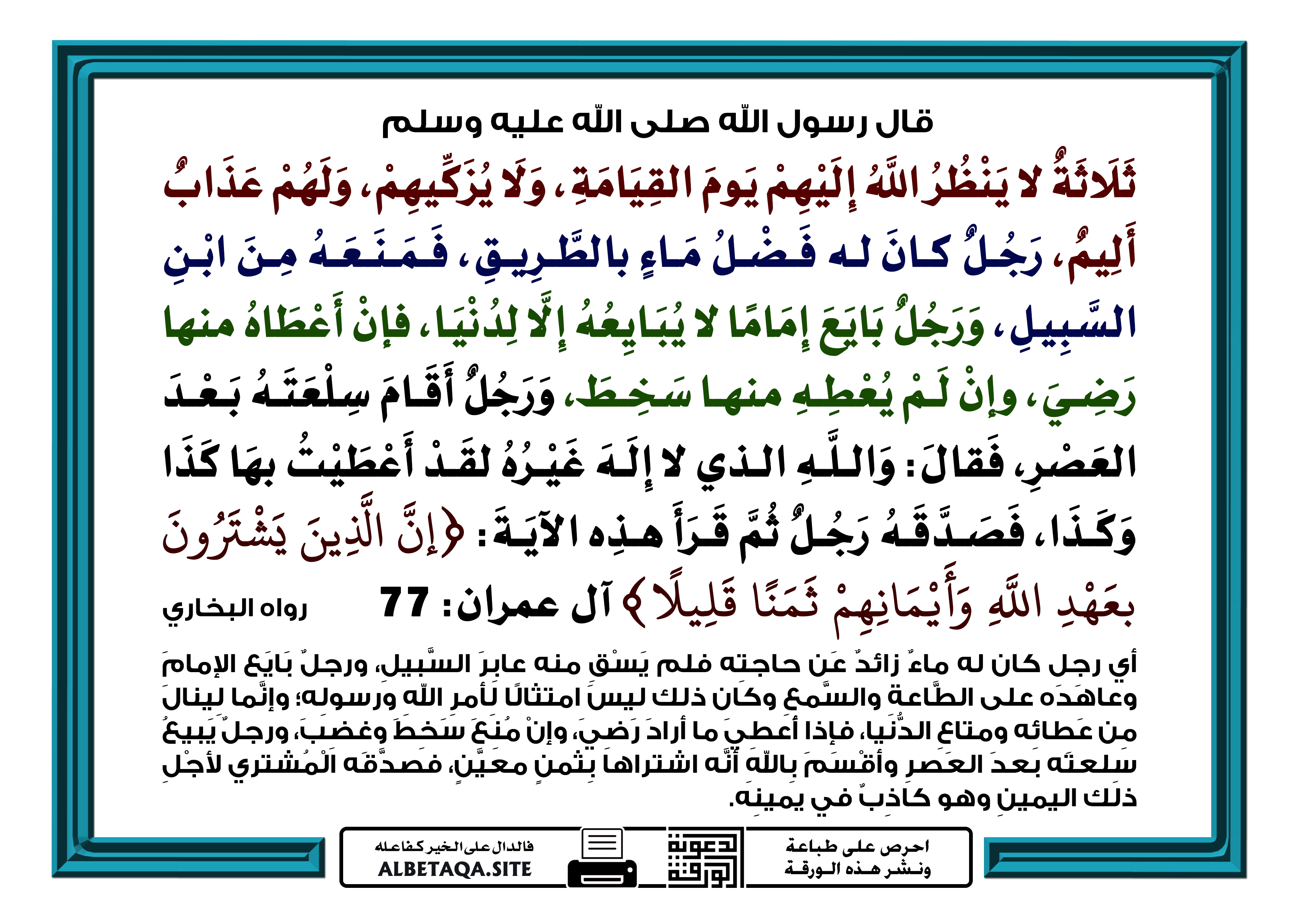 حديث ورجل بايع اماما. باب ما جاء في نكث البيعة 1595 حدثنا أبو عمار حدثنا وكيع عن الأعمش عن أبي صالح عن أبي هريرة قال قال رسول الله صلى الله عليه وسلم ثلاثة لا يكلمهم الله يوم القيامة ولا يزكيهم ولهم عذاب أليم رجل بايع إماما فإن أعطاه وفى له وإن. و ك ذ ا ف ص د ق ه و ه و ع ل ى غ ي ر ذ ل ك و ر ج ل ب اي ع إ م ام ا ل ا ي ب اي ع ه إ ل ا ل د ن ي ا ف إ ن أ ع ط اه م ن ه ا و ف ى. ما حكم مم استيقظ وتؤضا وصلا الفجر اماما ولما رجع الى البيت علم انه جنبا س ئل مايو 8 2018 بواسطة مجهول 0 إجابة 172 مشاهدة.