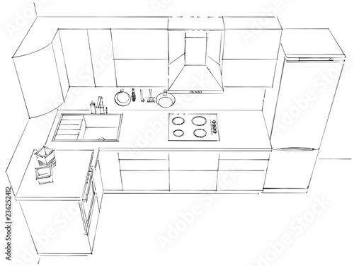 Contour Sketch Of L Shaped Kitchen Interior Black And White Top Perspective View Buy This Stock Illustration And Explore Similar Illustrations At Adobe Stock Adobe Stock